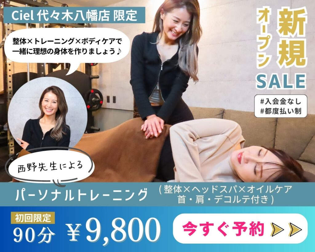 | 初回特別プラン (代々木八幡店限定) | 初回90分 9,800円 パーソナルトレーニング (整体×ヘッドスパ×オイルマッサージ 首・肩・デコルテ付き) |